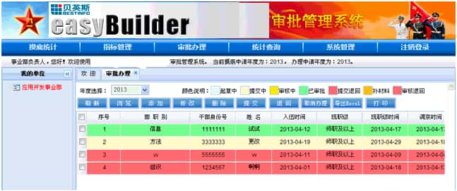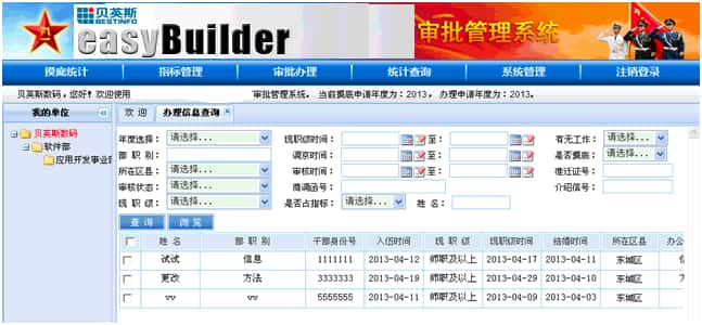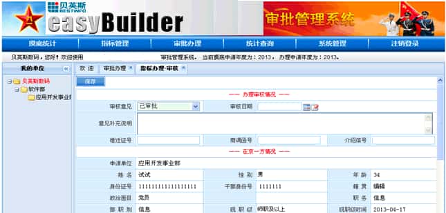 此系统服务于该单位系统内审批办理部门及各下级申报单位,具有使用范围广,层级多,业务流程完整的特点。系统包含了家属进京审批工作,从申请人员情况摸底统计、年度可办理指标分配和管理,以及审批办理的全过程,并可以进行各个工作阶段的相关数据统计和查询。方便了整个工作处理流程,免除了纸质文件报送审核的繁复过程,同时能够清晰直观的了解流程状态,方便各级单位的相关信息管理。