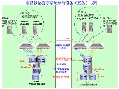 南昌铁路局客票系统的应用系统环境包括中心系统和车站系统,两个系统之间相距约10公里,利用EMC的Symmetrix存储设备进行双向的实时磁盘数据复制,也就是说,中心的存储系统除了存放本地使用的数据外,还存放着与车站系统数据完全一致的实时备份;同样,车站的存储系统除了存放本地使用的数据外,还存放着与中心系统数据完全一致的实时备份。当任何一个系统发生灾难性事故,导致业务中断,都可以利用远程备份的数据进行恢复。