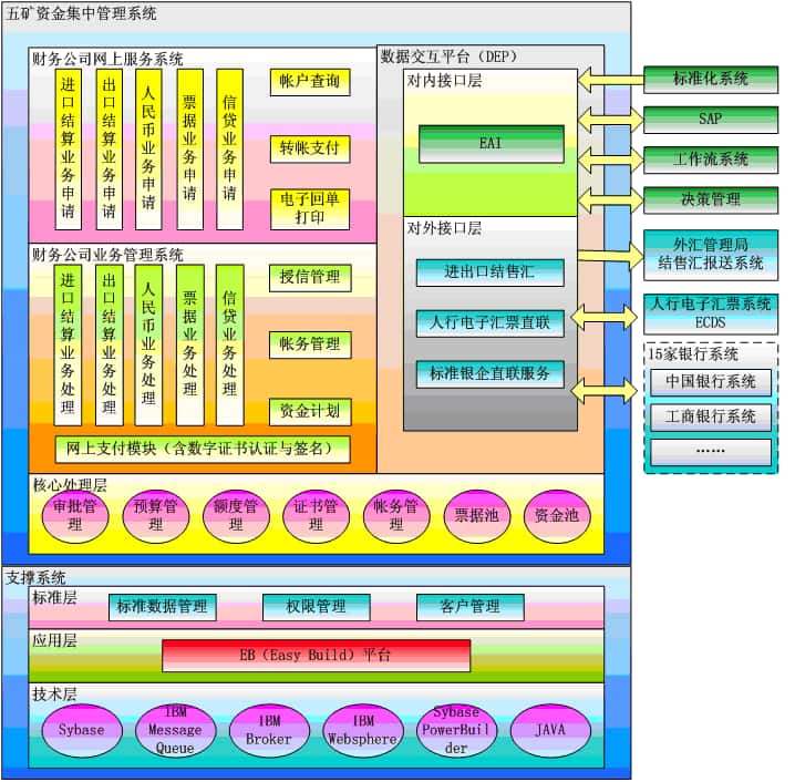 应用系统数据交互平台包含了集团内部EAI数据接口、银企直联支付平台和人行电子汇报直联接口,实现了资金集中管理系统与五矿集团公司内与标准代码和用户权限管理系统、ERP审批系统、SAP ERP财务业务系统和集团决策支持系统的集成;实现了对15家银行的实时支付和账户查询;实现了人民银行电子汇票第一批验收,成功上线电子票据系统。