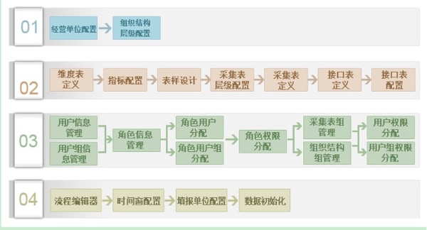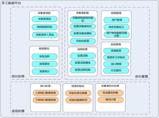 - 后台管理功能主要面向系统维护用户,可进行各类参数配置、采集表样配置、流程配置、填报周期初始化、权限管理等各类数据准备和变更调整功能。