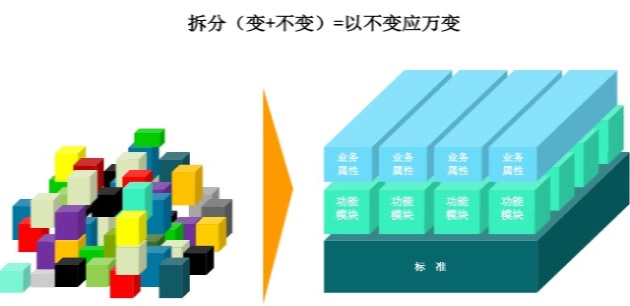 - 其次是使用更独立、更易理解的,抽象出来完全不为业务捆绑的“积木“来”搭建“系统,并赋予其业务属性,来实现业务功能。