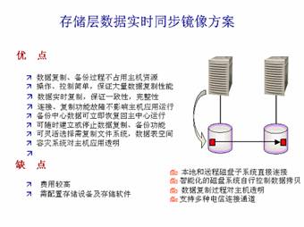 EMC的Symmetrix/CLARiiON系列均使用基于磁盘的远程镜像技术(SRDF/MirrorView),属基于存储系统的容灾模式。支持同步、异步的复制,支持多段复制,可采用多种连接方式(FC OVER ATM/DWDM/SDH/DARK FIBER等),不占用主机和IP网络资源,管理简单易行。技术成熟可靠,在全球远程容灾备份市场占据90%以上的份额。