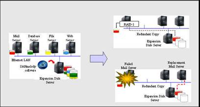 DataCore的这个解决方案的核心就是通过使用磁盘服务器(Disk Server) ,可以将其所连接的磁盘空间分配给其他的应用服务器,如邮件服务器,Web服务器,数据库服务器等。通过安装DataCore的SANmelody软件,通过产生各应用服务器磁盘的最新拷贝,但服务器或磁盘发生故障时,就可以快速的恢复生产的正常运行。