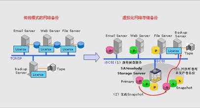 在传统的网络备份中,每一个需要备份数据的主机都需要安装备份代理,这对用户而言是一个不小的费用。通过使用快照,我们可以针对需要备份的生产卷产生快照,然后将快照加载到指定的备份服务器上,从而实现集中式备份。这种集中式备份免除了用户购买大量备份代理license的必要,为用户节省了大量的费用。