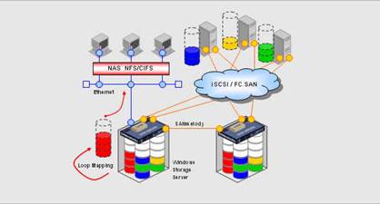 对有些应用环境,用户既要求有数据库文件存储又有文件型存储,这需要对NAS和SAN两种存储结构进行整合,DataCore能够同时提供iSCSI/FC SAN存储服务和Windows Storage Server功能,支持NAS NFS/CIFS文件访问服务,如下图所示。